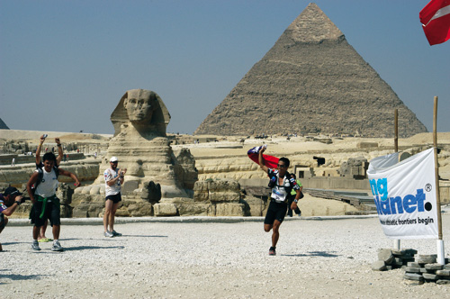 林義傑是國際知名的「台灣小子」,總是帶著中華民國國旗上山下海。圖為2005年參加「埃及撒哈拉超馬」,接近終點衝刺線時,將國旗披在肩上一路飄揚,接受各國民眾歡呼。