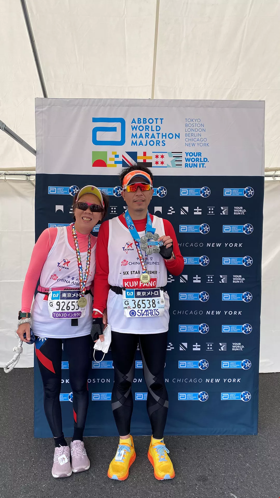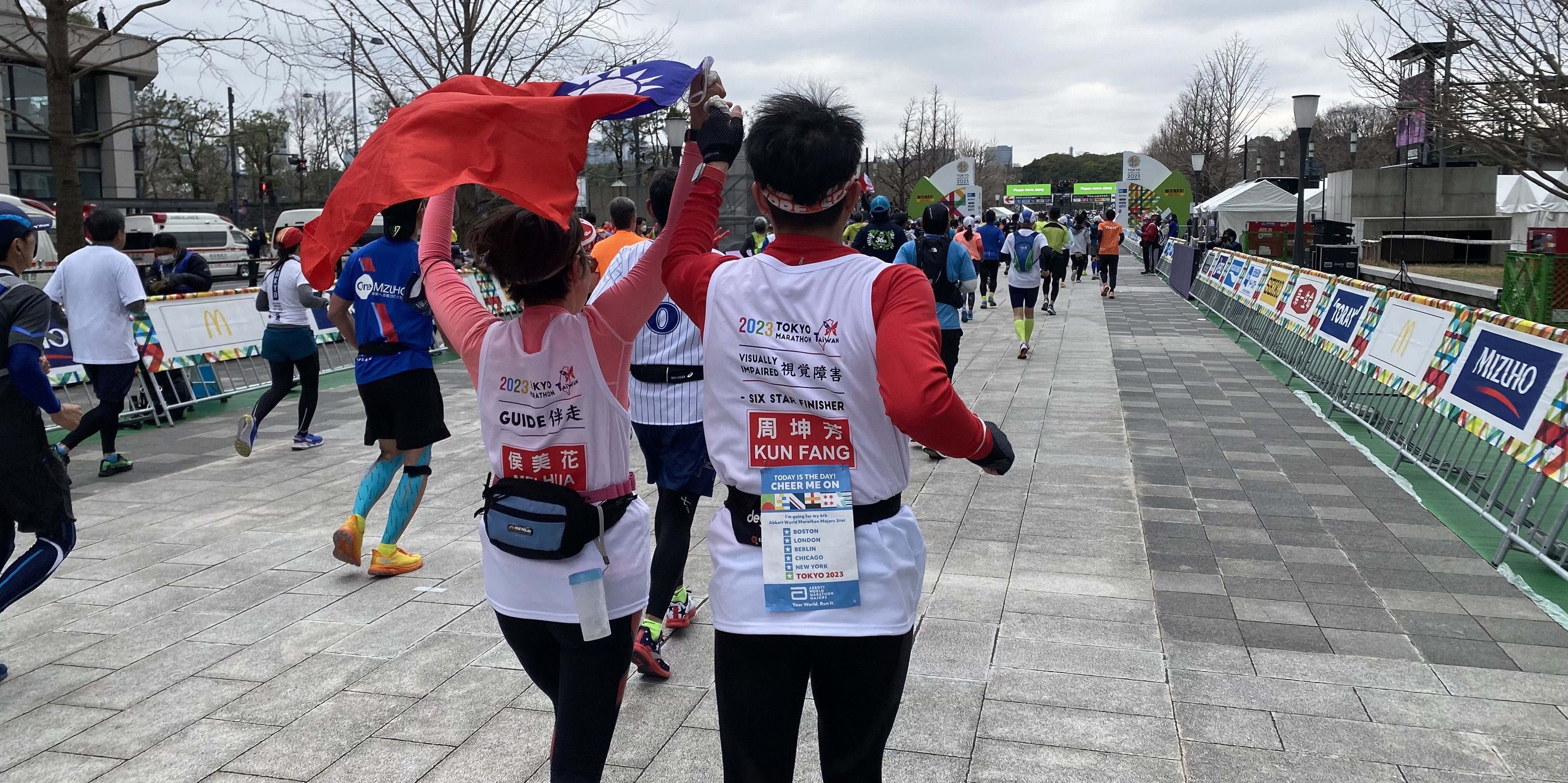 經歷疫情爆發,讓參賽的步伐稍稍慢下來,但也沒有停歇太久,他們在2021年前往英國完成倫敦馬拉松賽事;2022年接續完成原定2020年參加的波士頓馬拉松;最後一站日本東京馬拉松,於2023年3月完成。從主辦單位手上接下象徵六大賽事的「甜甜圈獎牌」,周坤芳成為全台首位完成六大馬視障跑者的紀錄。