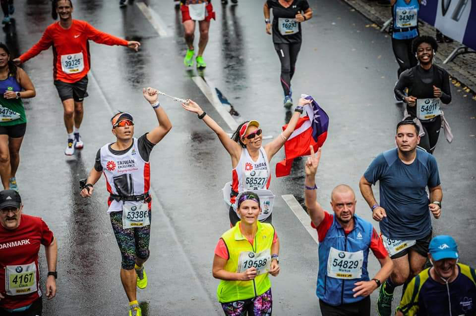 從第一場柏林馬拉松(上圖),到最後一場東京馬拉松(下圖),周坤芳(下圖右)的六大馬之旅,身旁總能看到侯美花(下圖左)的身影。(侯美花提供)