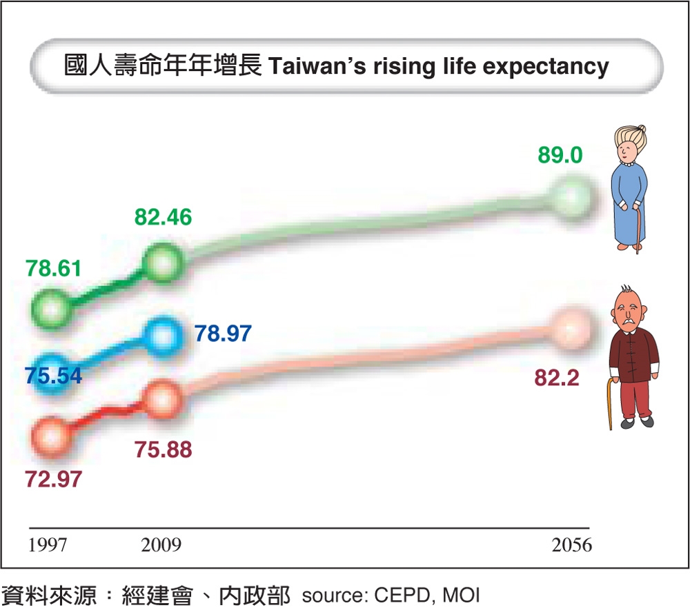 2010年台灣人口結構有些變化,好消息是國人平均壽命比前一年增長了0.4歲(來到78.97歲),壞消息則是出生嬰兒數比前一年少了七千多人,連續第2年低於20萬人(19.13萬人),粗出生率為千分之8.3(每1,000人口新生8.3人),再創新低。在國人越活越長,扶養人口卻越來越少之下,如何頤養天年,已成為重要課題。