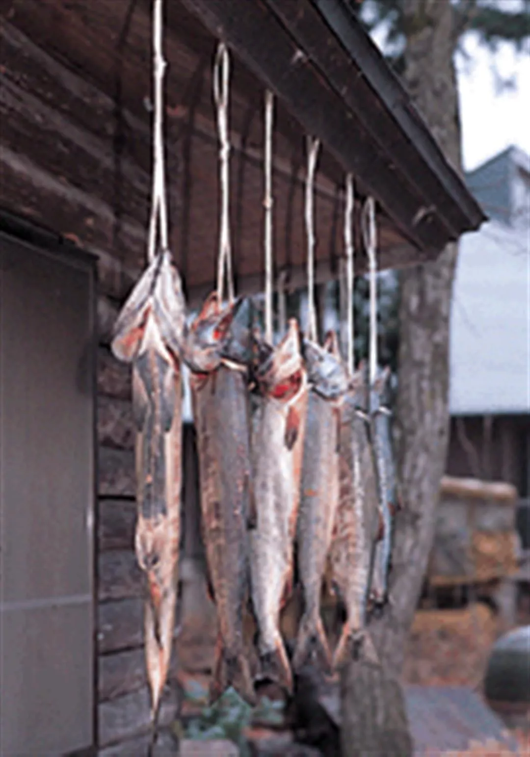 魚串掛在三島町餐廳的屋簷下,準備過年吃。
