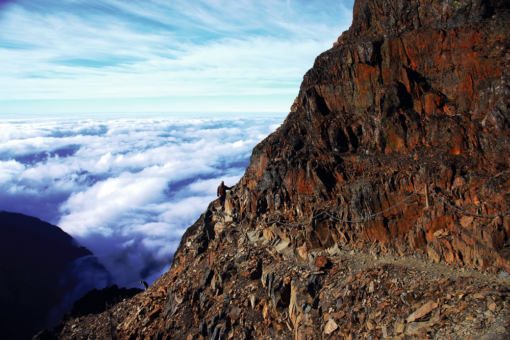 山,給人向上的力量。攀登玉山主峰,更是有如漫步雲端,崩落中的頁岩地質,走來更是步步驚心。(林信智攝)