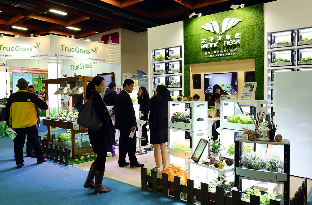 台灣近年來的綠色服務外銷主力商品「水耕/水植工廠」,也有多家廠商赴展。例如,以水植觀賞植物花器和「魚花共生」產品為主的新光綠寶公司,生產密閉式設計「水耕種植箱」的穎瑭永續服務公司,以及以植物工廠規劃工程聞名的樂佳光能應用公司等,都在攤位上推出新產品。綠盈盈的小型植物箱發出亮光,十分討喜可愛,國際採購訪客絡繹不絕。