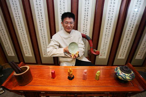踏出藝品收藏的第一步後,他開始對印石產生興趣,因有長輩告訴他:「早年逃難時,不帶黃金,易遭匪劫,而是身帶田黃石。」印石界有「一兩黃石,三兩金」的說法,原來一塊「石頭」的價值,比黃金還高。