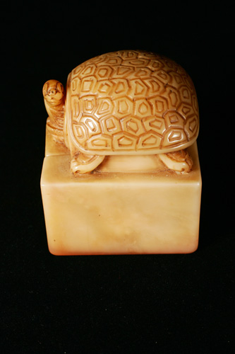 壽山石(6.3 cm×4 cm×4.1 cm),清初,靈龜造型的母子套章。