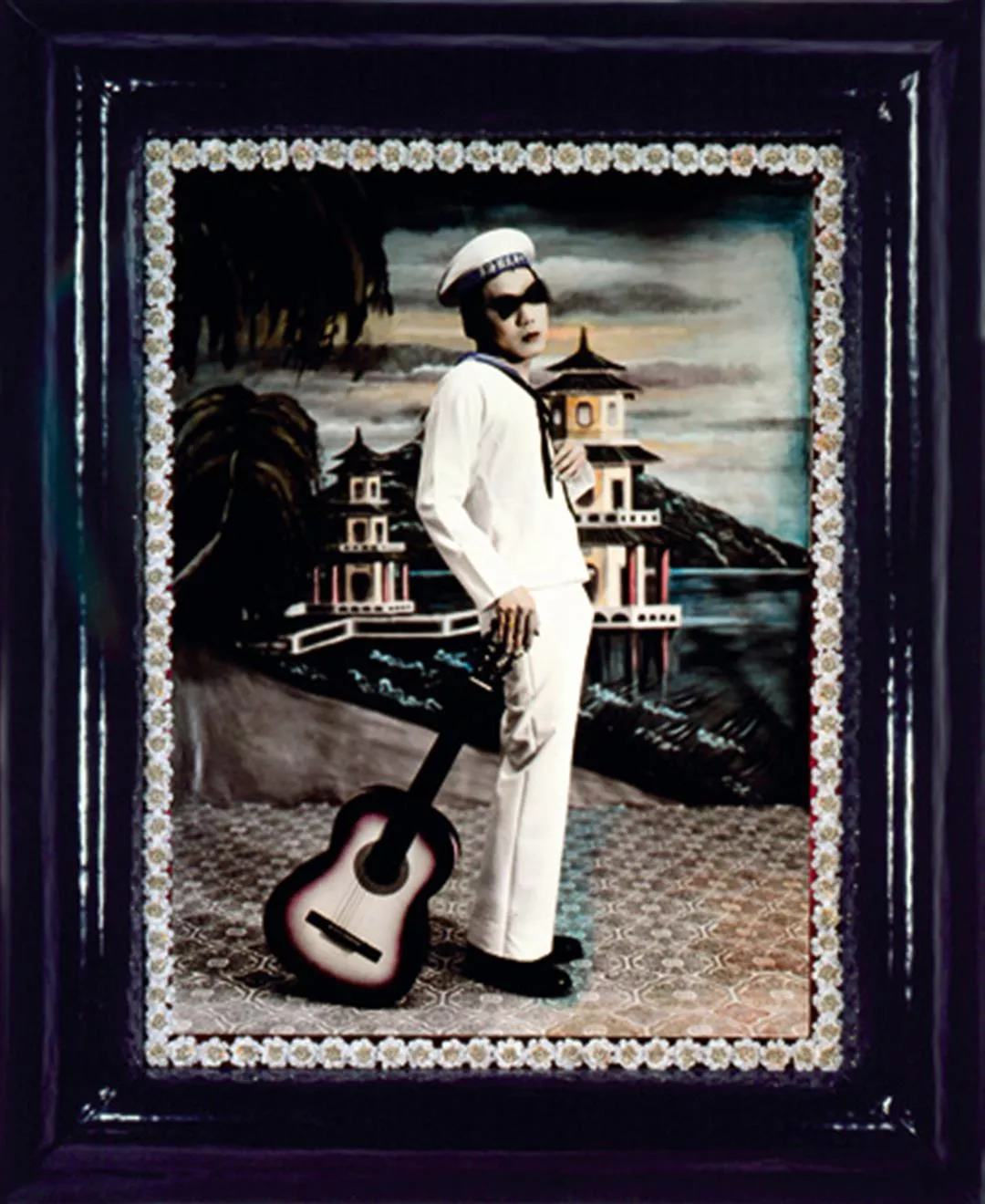 在假鑽裝飾的畫框中,由藝術家洪東祿扮演的人物站在高雄知名景點春秋閣的手繪布景前,他身穿水手制服,臉色白皙,唇抹胭脂,側身擺出矯揉姿勢,左手撫弄胸前半短的領巾帶,右手斜撐著一把吉他,眼睛則被黑色蝴蝶結遮住,褲檔隱約呈現奮起狀態。