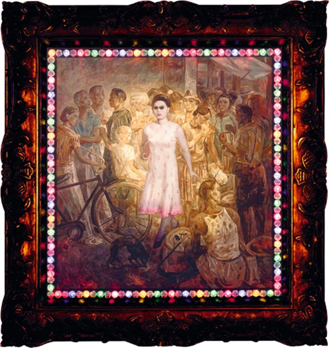 〈戀戀紅塵II─—向李石樵致敬〉是混合媒材裝置作品,展現吳天章「魔術」與「特技」並行的獨特手法。