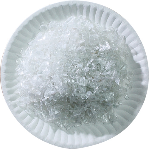 回收寶特瓶經由分色、清洗、粉碎等步驟,就可製作成雜色PET碎片(圖1)及透明PET碎片(圖2),再經高溫熔融等步驟,就可進一步製作可抽絲成紗的PET酯粒(圖3)。