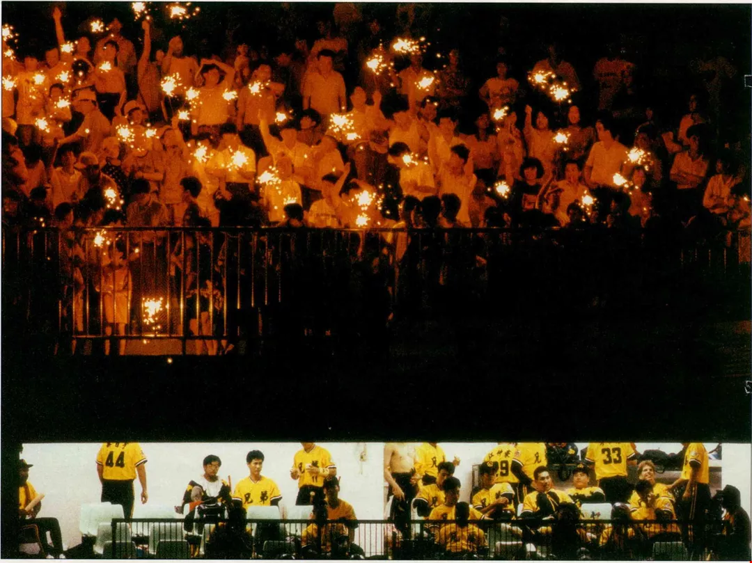 球場停電,球員只好在休息室枯坐等待;球迷則在觀眾席上玩起仙女棒打發時間。(中華職棒雜誌)