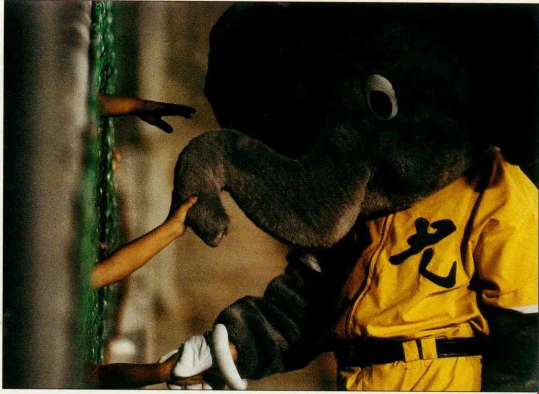 大象是兄弟隊的吉祥物,經常得扮演詼諧的角色。圖中大象和球迷握手,另一位觀眾卻調皮地「握鼻」示好。(中華職棒雜誌)