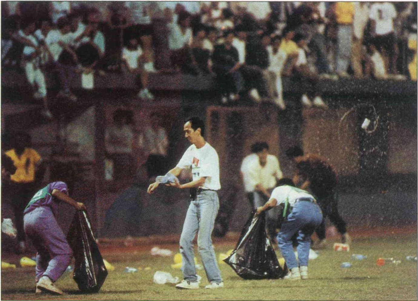 球迷若無法克制情緒,就會形成這種「你丟我撿」的畫面。