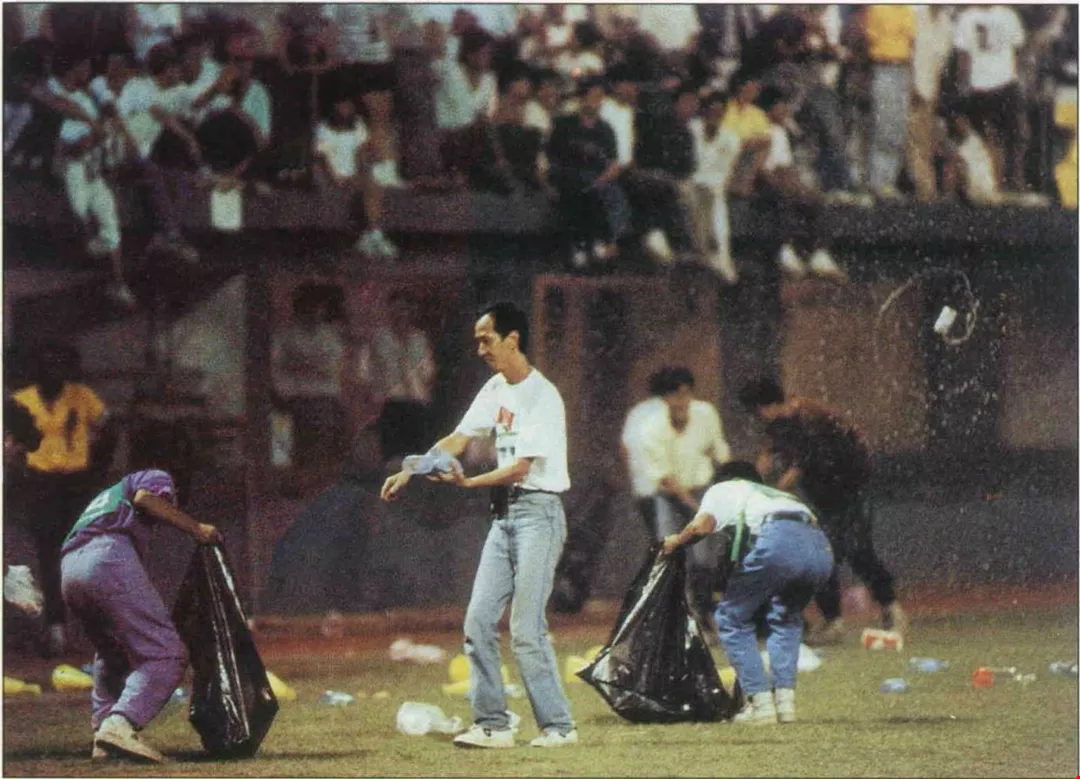 我就知道,象迷又在往場內丟東西了。江泰權還真有風度,把汽水罐撿一撿,還向象迷一鞠躬。