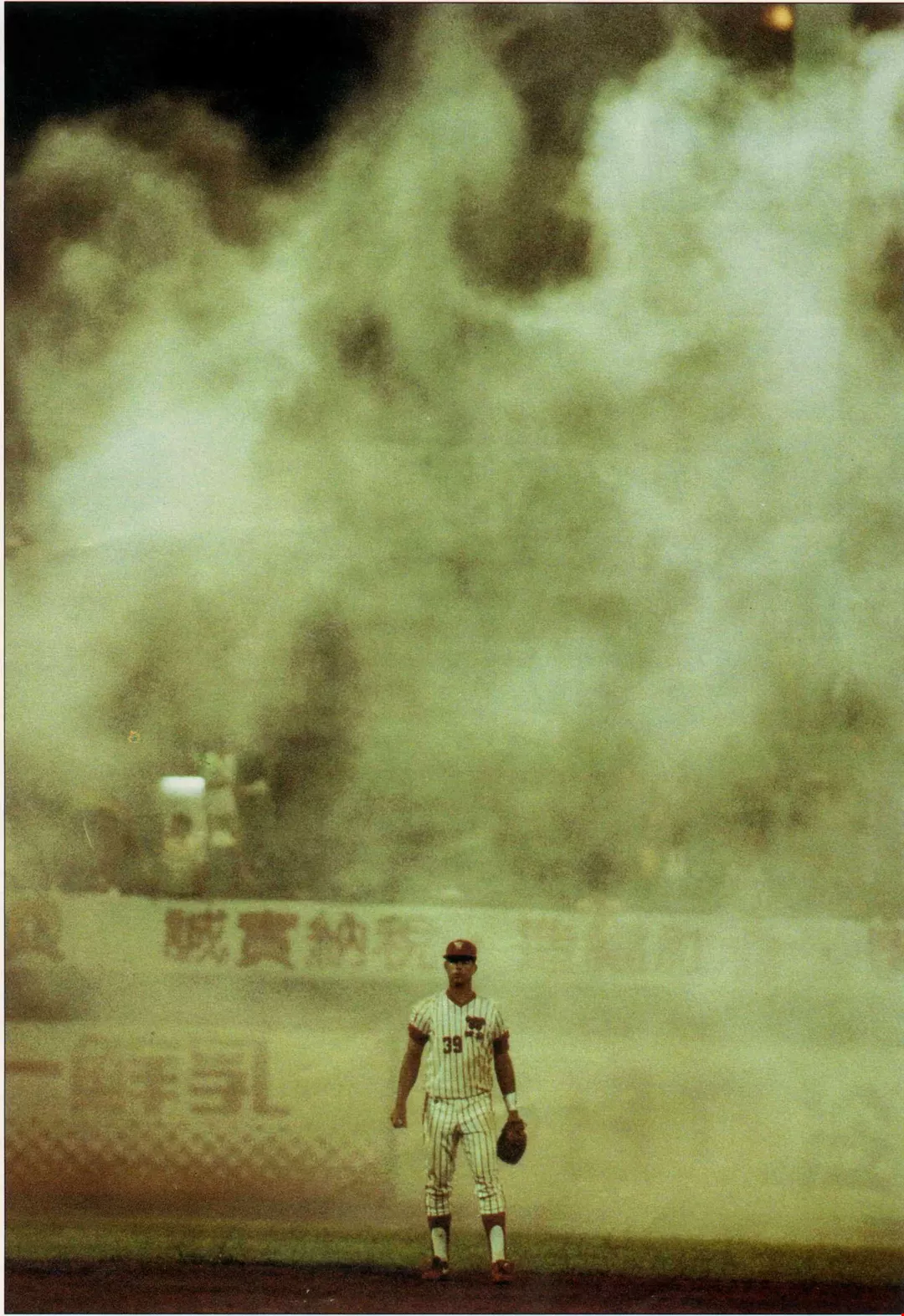一陣沖天砲過後,球場上煙霧瀰漫。在球場上放砲?顯示我們的觀球文化尚待提昇。(中華職棒雜誌)