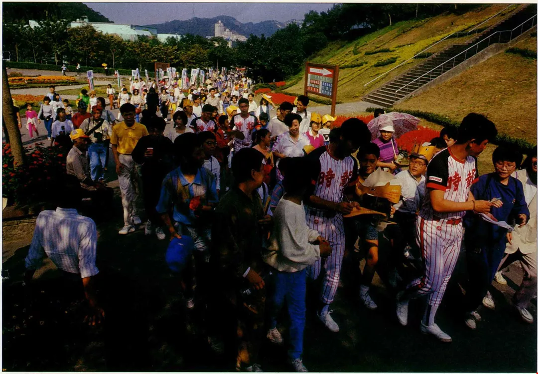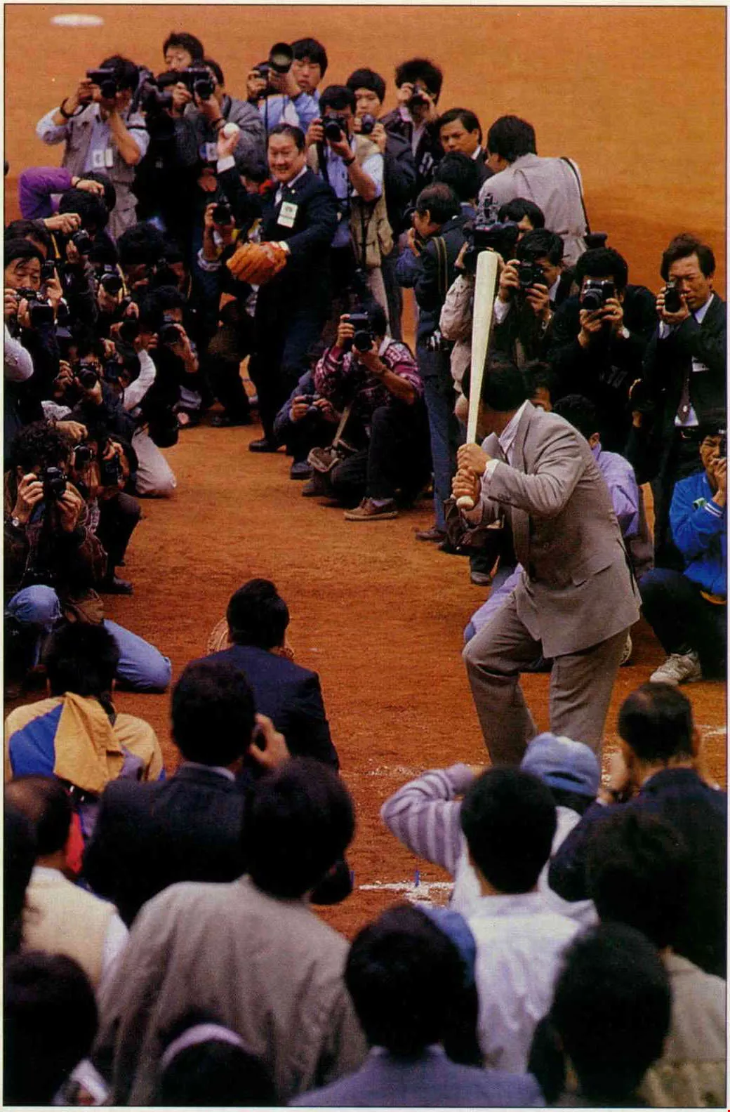 職棒蓬勃發展,不少媒體投注人力、專闢篇幅加以報導。一場由王貞治擔任打擊者的開球儀式,引來許多攝影記者爭相拍照。(中華職棒雜誌)