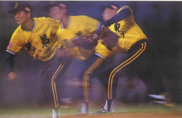 慢快門加上重覆曝光,兄弟投手陳憲章的投球動作呈現出流暢的動感。