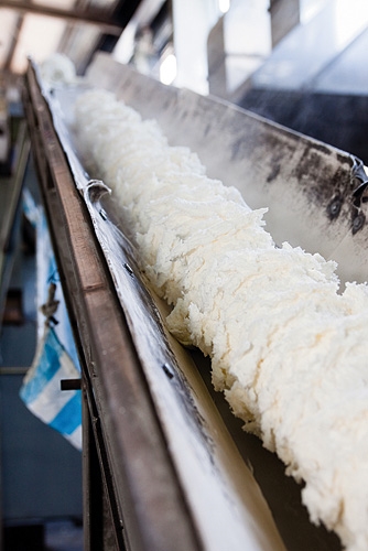 祥益的米粉製造流程:1.將玉米澱粉、小麥澱粉及在來米米漿混和製成的米粉原料送上輸送帶,蒸至半熟。