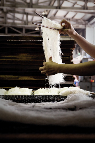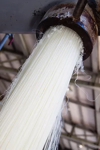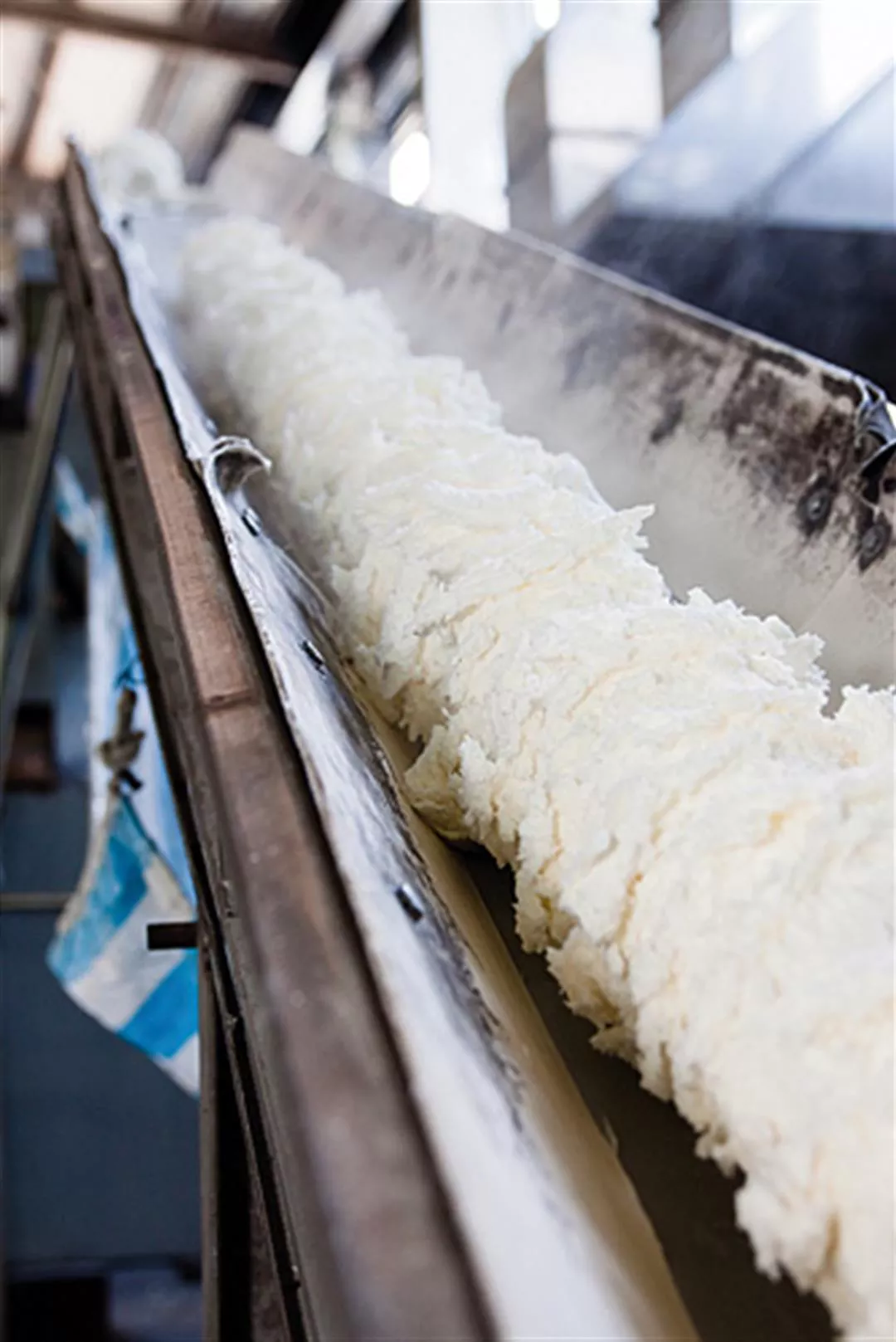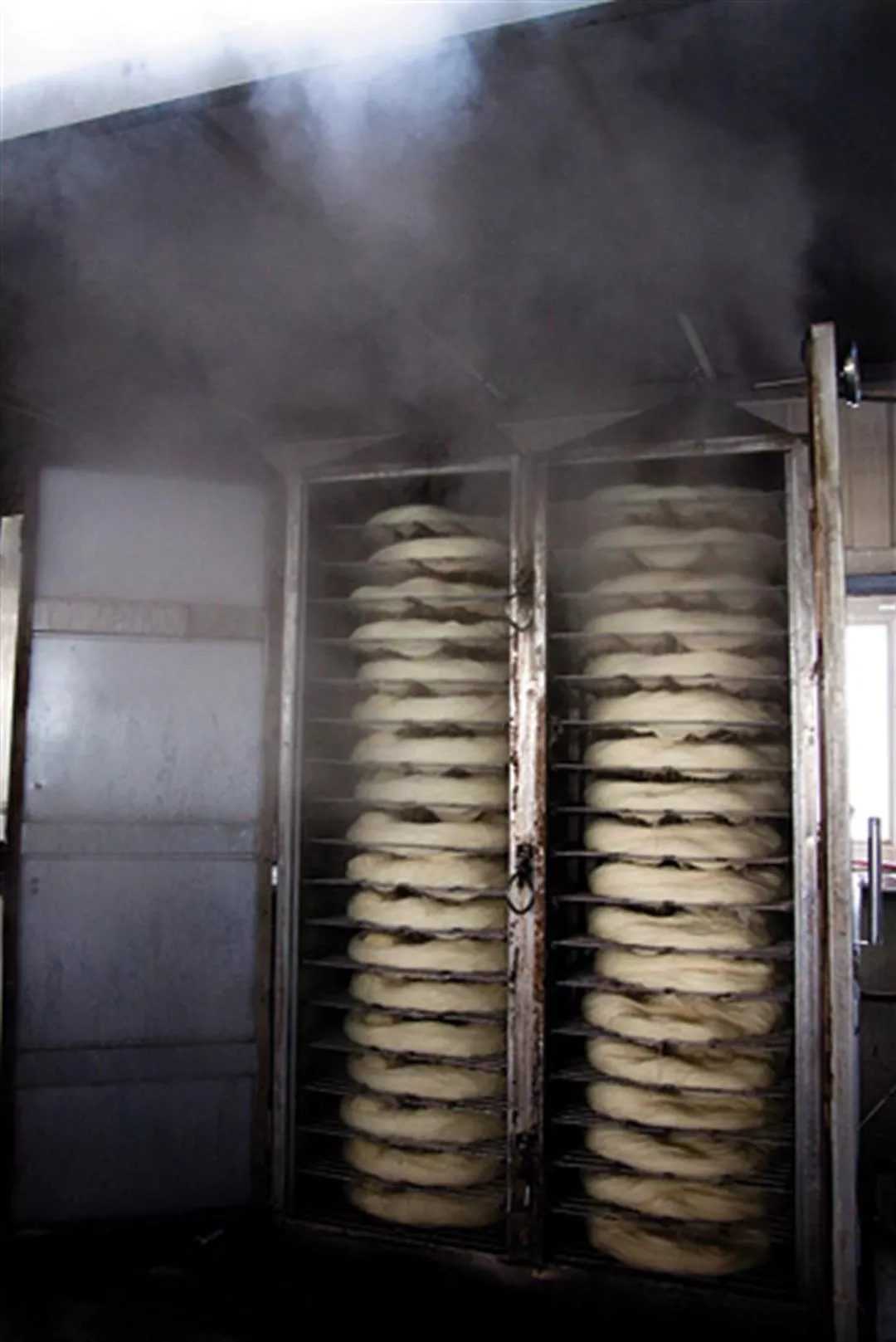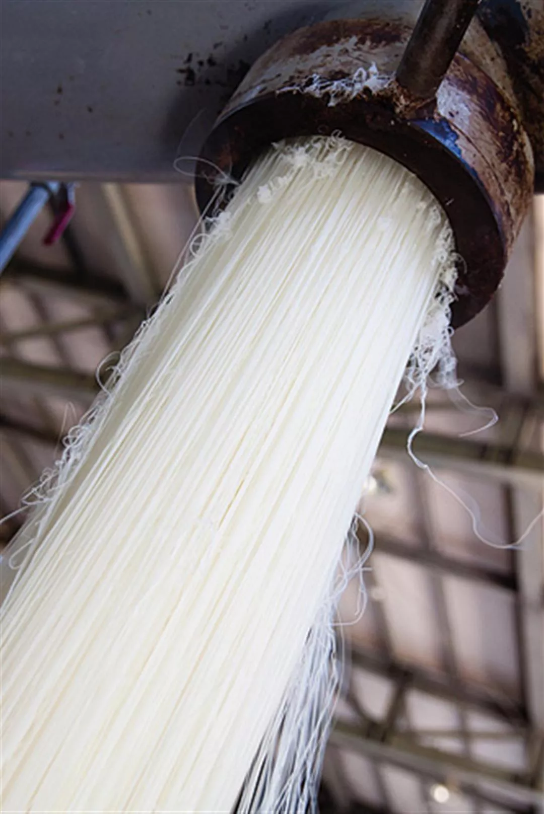 接下來,混和後的原料在輸送帶上用蒸汽蒸至兩分熟,再以米粉筒將粉團壓實,通過孔盤篩切成絲絲分明的粉條後,盤裝成坨狀,送入攝氏120度高溫蒸箱蒸至全熟。