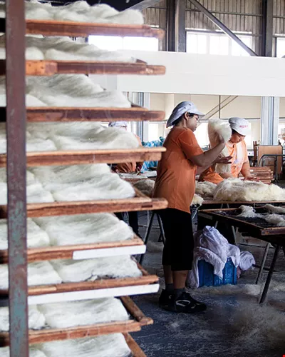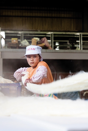 然而,加工至此,米粉本體仍是濕的。只見一組員工將濕粉裁切成四、五十公分的包裝長度後,另一組員工操持長柄竹筷,以3秒做完一份的速度,俐落地把米粉夾摺成長形手帕狀,鋪在網架上,等候烘乾。