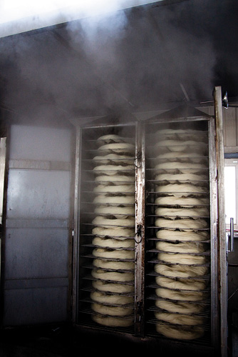 數分鐘後,熟透的米粉「出炊」,被取出蒸箱,攤在桌上散發著白色蒸煙與米香。