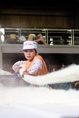 說到祥益新竹米粉的製作工序,在工廠內總是穿著Polo衫、牛仔褲與球鞋、以小跑步穿梭各工作站之間的老闆娘李秋霞,喜歡用「洗蒸汽浴、馬殺雞」的有趣比喻,向訪客介紹。
