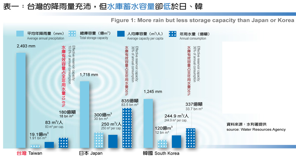 說來弔詭,台灣的年平均雨量多達2,500毫米,是世界平均值的2.6倍,卻因降雨分布極不平均,實際上可利用的水資源只占總雨量兩成;再加上人口密度高,每人每年可分得的雨量,僅為世界平均值的1/7~1/5,因而名列全球第18位缺水國家。