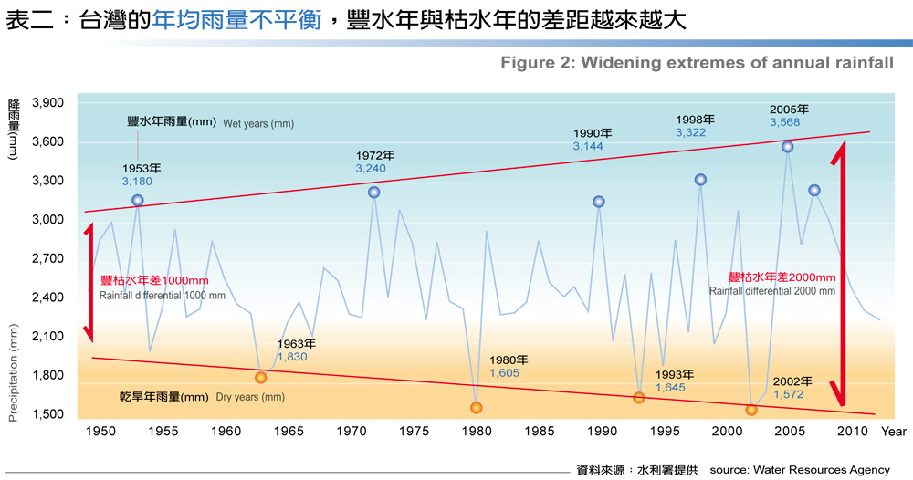 經濟部水利署副署長田巧玲即指出,攤開台灣過去60年來的雨量紀錄,可發現降雨鴻溝正在逐年擴大。在1950~60年代,豐水年和缺水年的雨量差距約為1,000毫米;但2000年以降,兩者的落差已高達2,000毫米;意謂經過數十年的氣候變遷,台灣的年平均雨量雖然仍維持不變,但旱、澇年份的出現機率卻大幅提高。(見表二)