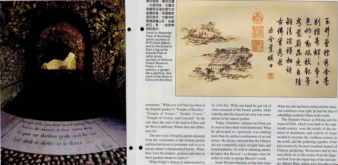 景中有詩,園林如畫,中西同矣。左圖為英國思朵海莊園中波普題詩處(英國國家信託提供)右圖為乾隆題避暑山莊「金蓮映日」景。(故宮博物院提供)