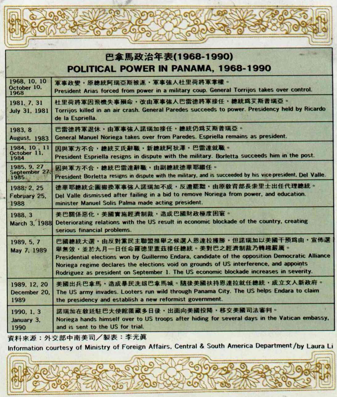 原來在一九八一年時,巴拿馬軍事強人杜里荷將軍因飛機出事殞命,另一位強人巴雷德將軍想取而代之。為了爭取近十萬的華裔支持,他特別向僑社大老、曾任巴拿馬國家銀行董事長多年的陳奉天請益。陳奉天於是邀集了多位學有專精的華裔子弟,每人事先對僑社面臨的一個問題詳加準備,並和巴雷德將軍當面對談。