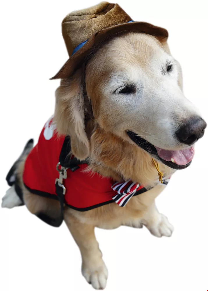 愛心服務犬協會創辦人林烱彥(Bank拔)則替Bank戴上帽子與領結,這隻相當於人類70高齡的老狗,有著老神在在的沈穩氣質。
