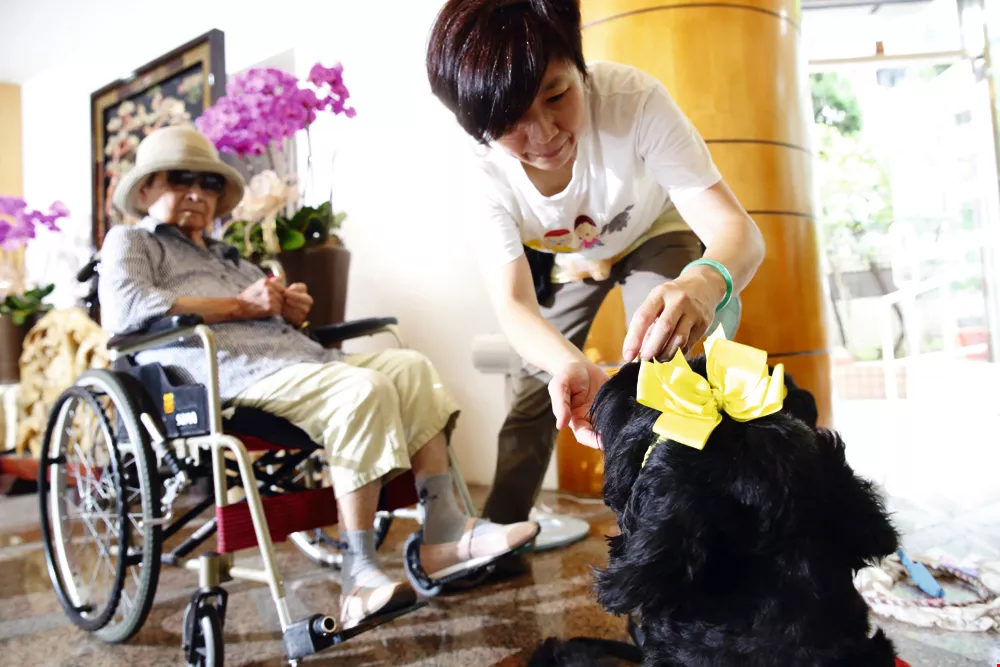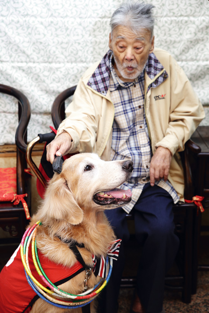 一大早,台灣愛心服務犬協會志工帶著狗醫師來到位於內湖的私立仁愛頤養園。