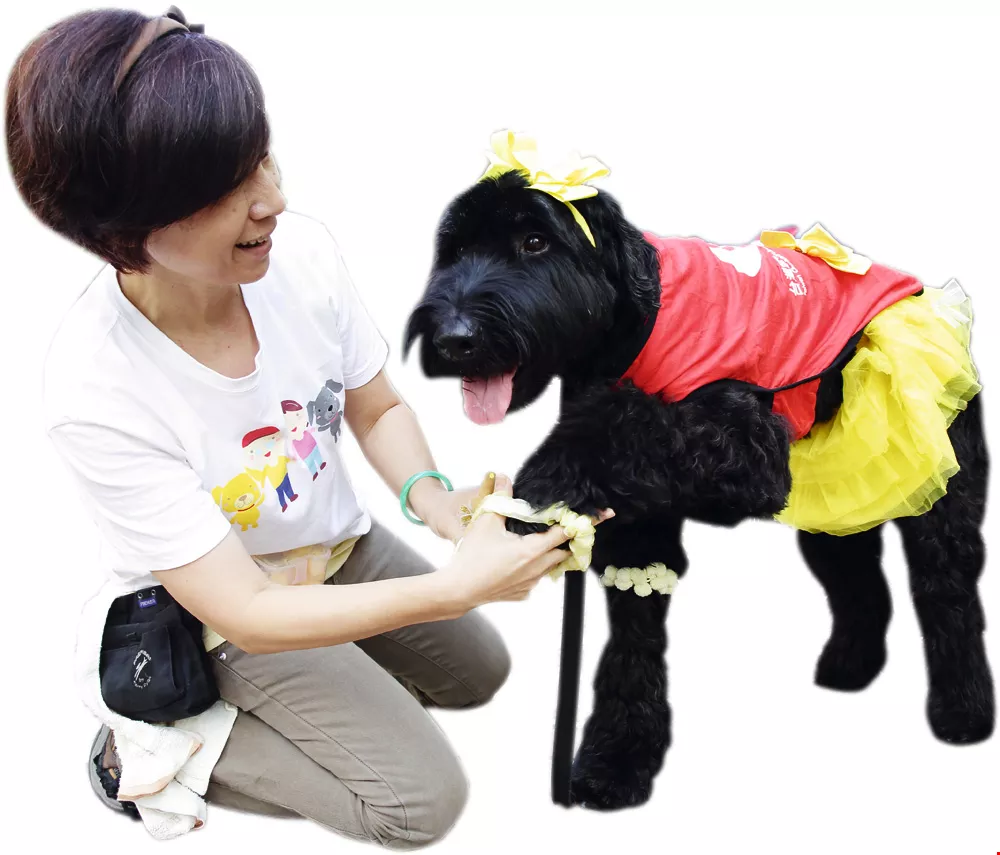 鄭少雯幫毛色全黑的Winner穿上工作背心與蓬蓬裙,牠立即亮眼了起來,且開始有「上班」的工作意識。