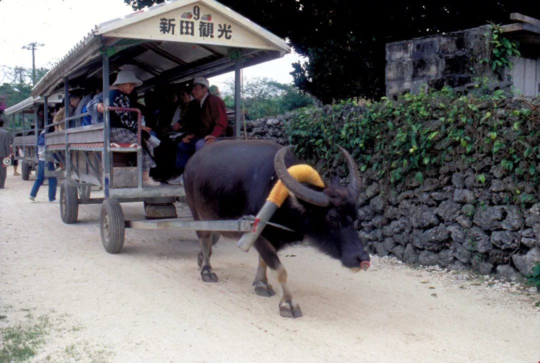 曾是石垣島開墾功臣的台灣水牛,如今已移作觀光噱頭。圖為鄰近竹富島的觀光牛車。