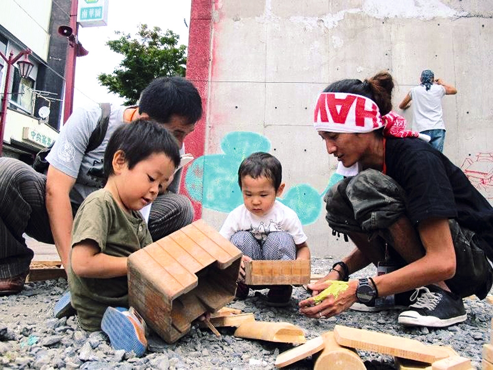 今年5月新台灣壁畫隊正式在石卷市搭木屋(蓋白屋),與當地藝術家一起創作。