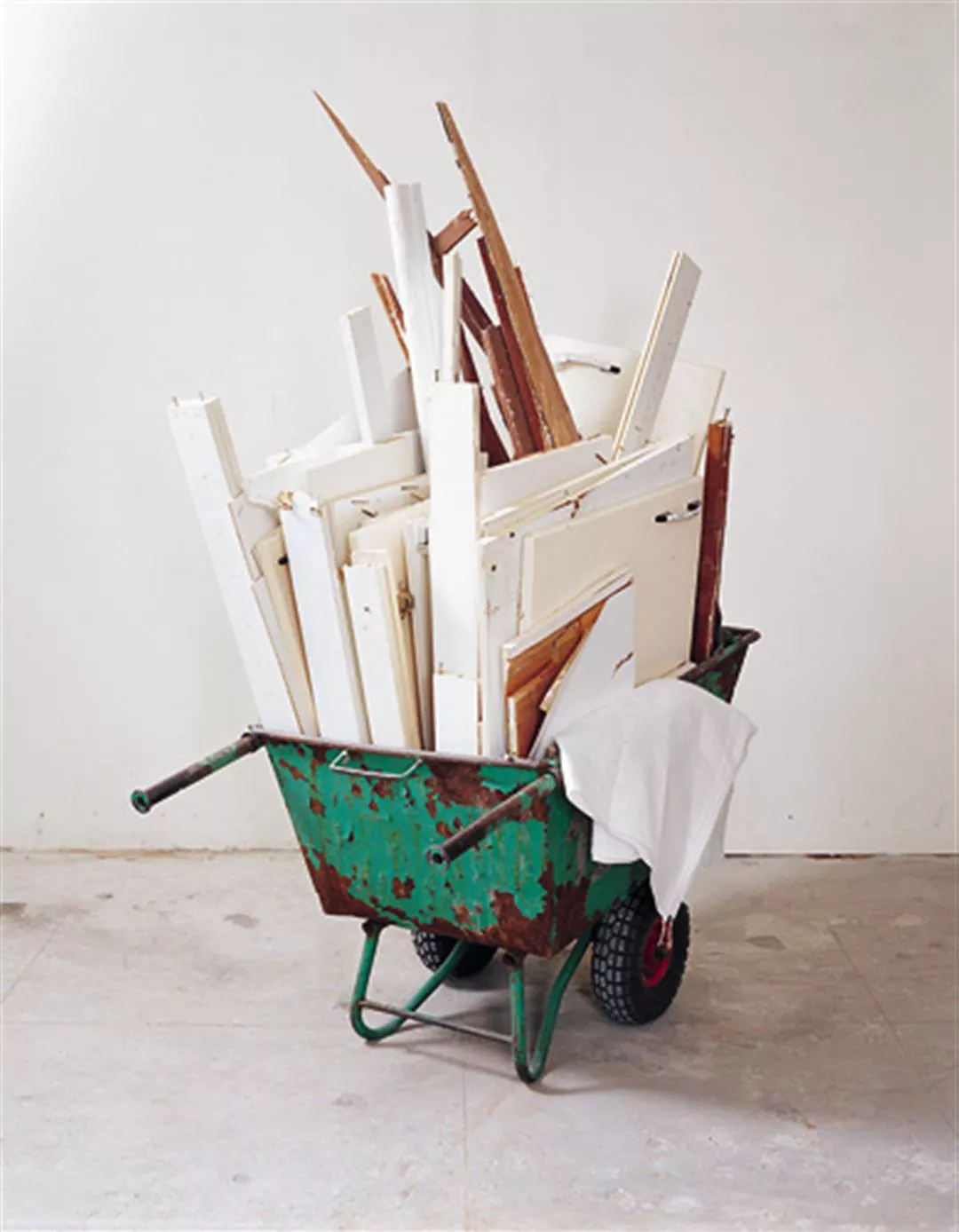 其中,四幅大型彩色攝影作品最具代表性。畫面中,四台不同的手推車堆置著待清運廢棄物,雜亂中卻散發著新生的幸福色彩。照片裝置在展場時,推車的手把立體到幾乎就像3D作品一樣真實,讓人忍不住衝動,想握住手把直接推出去。