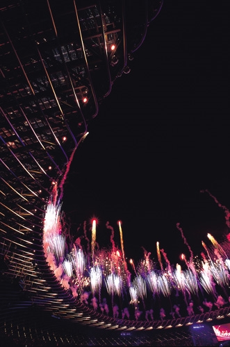 「龍騰」主場館的外觀上就像一條迤邐欲飛的龍,並大膽採用了帶有迎賓意味的開口型設計,龍的首尾並不相啣,完全顛覆了以往運動會場總是圓形或蛋形設計的窠臼。