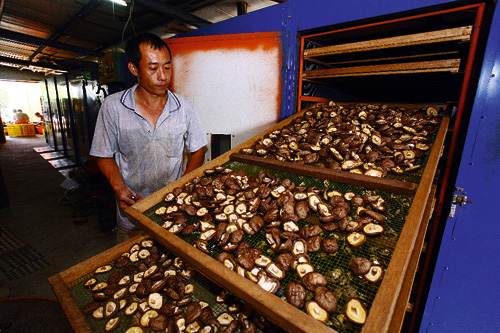 新鮮香菇要立刻整理、分級、烘乾,剪去的菇腳是重要素料來源。經過20小時的烘焙,色香味俱全的乾香菇出爐。這一季的辛勞都濃縮在倉庫裡,就等盤商來批得好價錢。