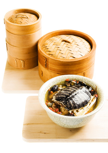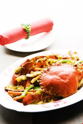 雞仔豬肚鱉、百合烏魚子、三峽海明蝦,咖哩炒膏蟳,位於101大樓85層的「101食藝軒」(左圖),走高檔台菜路線,顧面子也顧裡子。《欣葉心、台菜情》賽尚出版提供。