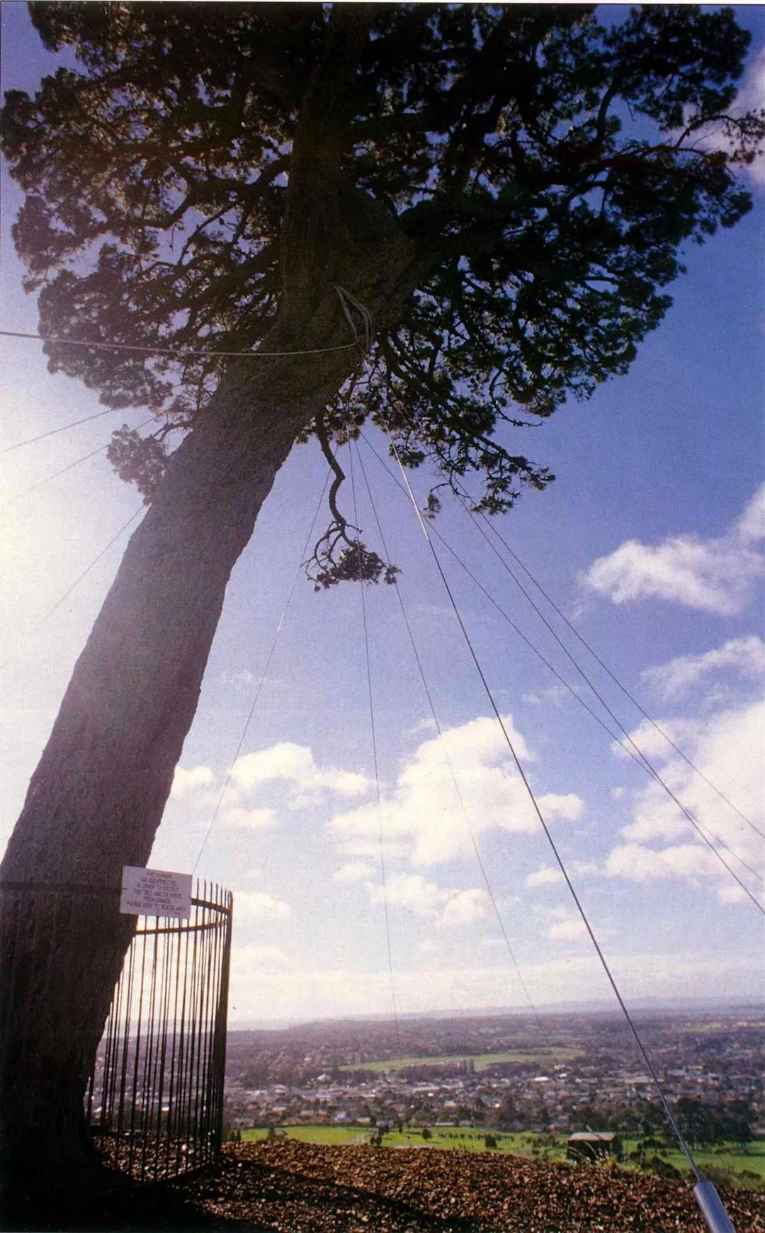 這棵象徵白人統治勢力的放射松,曾遭毛利激進份子鍊鋸斲傷,紐西蘭政府花下大把銀子搶救。(薛繼光)