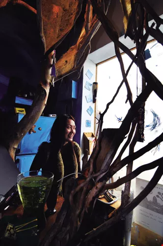 女妖藝廊的負責人李韻儀說,「女妖」是象徵著人們內心創作火焰的喚醒,以及自由能量的釋放,大可不必拘泥於生理上是男是女!圖中藝廊的咖啡吧,從主結構到燈飾及牆面彩繪,都是阿美族藝術家伊命與妻子饒愛琴的合力創作。