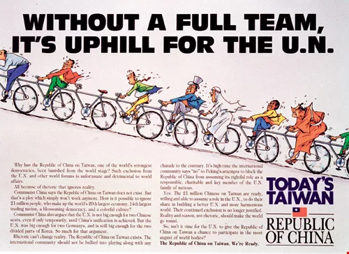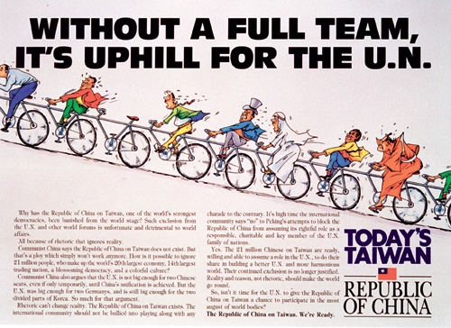 1993年起,新聞局陸續推出「參與聯合國」的廣告,例如該年的「協力車」篇,以各國人士共乘一部協力車正騎在上坡路,但其中卻有一個座位空著,隱喻我國若能參與聯合國,必能提供助力;1995年正值聯合國成立50週年,則以一幅有聯合國國徽的拼圖,獨缺一塊台灣而顯得不完整的廣告,呼籲世界各國支持我國加入聯合國。