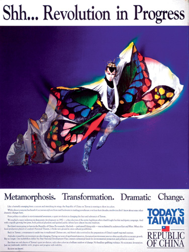 1993年一則刊登在美國主流媒體的廣告,畫面上,模特兒雙手張開彷彿蝴蝶色彩艷麗的雙翼,以蝴蝶的蛻變,隱喻台灣四十年來的進步。當時構思廣告創意時,新聞局的評選會議中曾有人反對以「生命短暫」的蝴蝶為意象,但廣告公司以蝴蝶破繭而出、生生不息說服大家;結果廣告刊出後,有美國人士大為驚艷,寫信給新聞局要求購買這幅海報,布置辦公室。