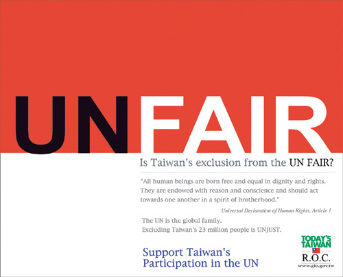 2004年更「轉守為攻」,一改以往溫和、低調、迂迴的態度,直接挑戰聯合國將台灣排除在外是「不公平」的,英文標題寫著「UNFAIR」,有「聯合國大會」和「不公平」的雙關意涵,創意十足,文案則陳述「聯合國是世界大家庭,將台灣2,300萬人排除在外是不公義行為。」