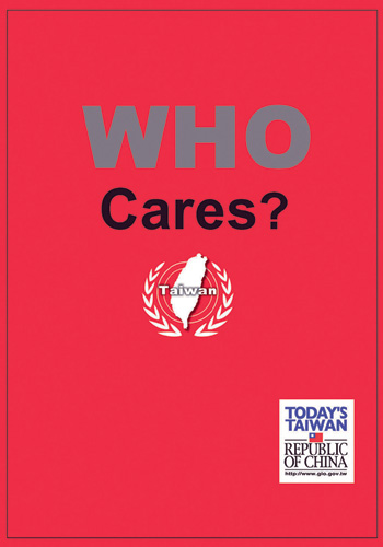 2003年SARS疫情由大陸廣東傳染開來,波及港澳台灣,因無人知道它的起因與治療方式,造成人心惶惶,百業蕭條。當年7月台灣自世衛組織感染區除名後,新聞局即製作了「擁抱地球」篇廣告,呈現疫情過後國人歡樂健康的心情;2004年又以一幅標題為「WHO Cares?」,「誰在乎?」或「世衛組織在乎嗎?」的雙關廣告,呼籲國際社會支持台灣加入世衛組織,形象與議題並重。
