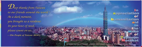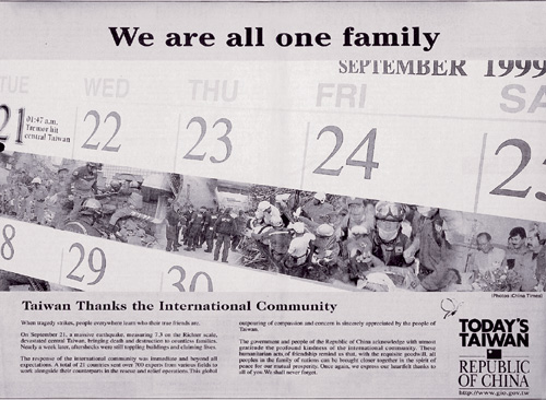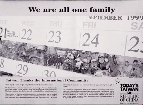 921大地震(左)和莫拉克風災後,新聞局製作了「四海一家」的廣告,感謝國際社會伸出援手。