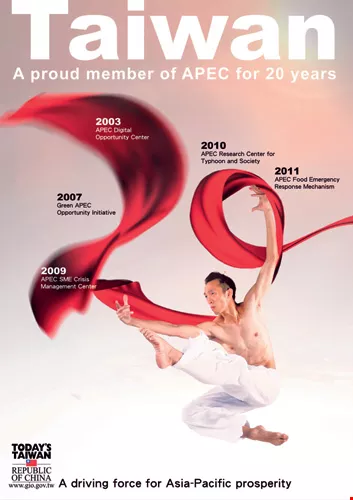 台灣加入亞洲經濟開發組織二十年,是推動亞洲繁榮的助力,廣告構圖以雲門舞者跳躍的文化意象為創意。