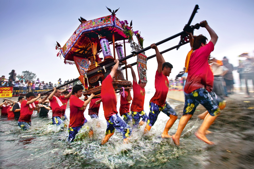 新塭迎水神 文‧莊坤儒 圖‧鄧福隆/交通部觀光局提供 2013 8月 EN 分享: 嘉義縣.布袋鎮嘉應廟 先民渡海來台,篳路藍縷開墾家園,建廟尋求心靈寄託。 農曆3月27日,鄰近的巡守王爺共20尊神明,經水路進入新塭地區作客。 嘉應廟供奉的神明為盡地主之誼,數十頂神轎衝轎下海迎接,就是「衝水路,迎客王」的由來。 分享: