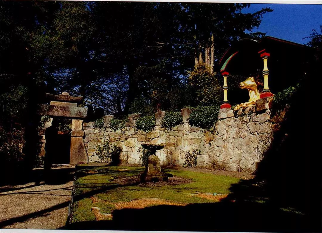 維多利亞主題公園裡的金牛盤踞,頗收「驚悚」之效。圖為英國碧德福花園。