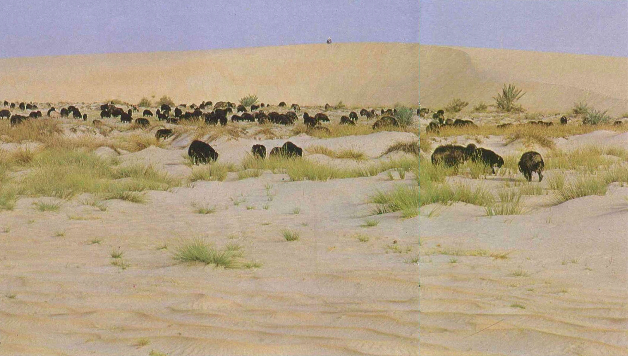 沙國百姓多賴放牧為生,圖為牧人高坐沙丘上,俯視羊群的情形。