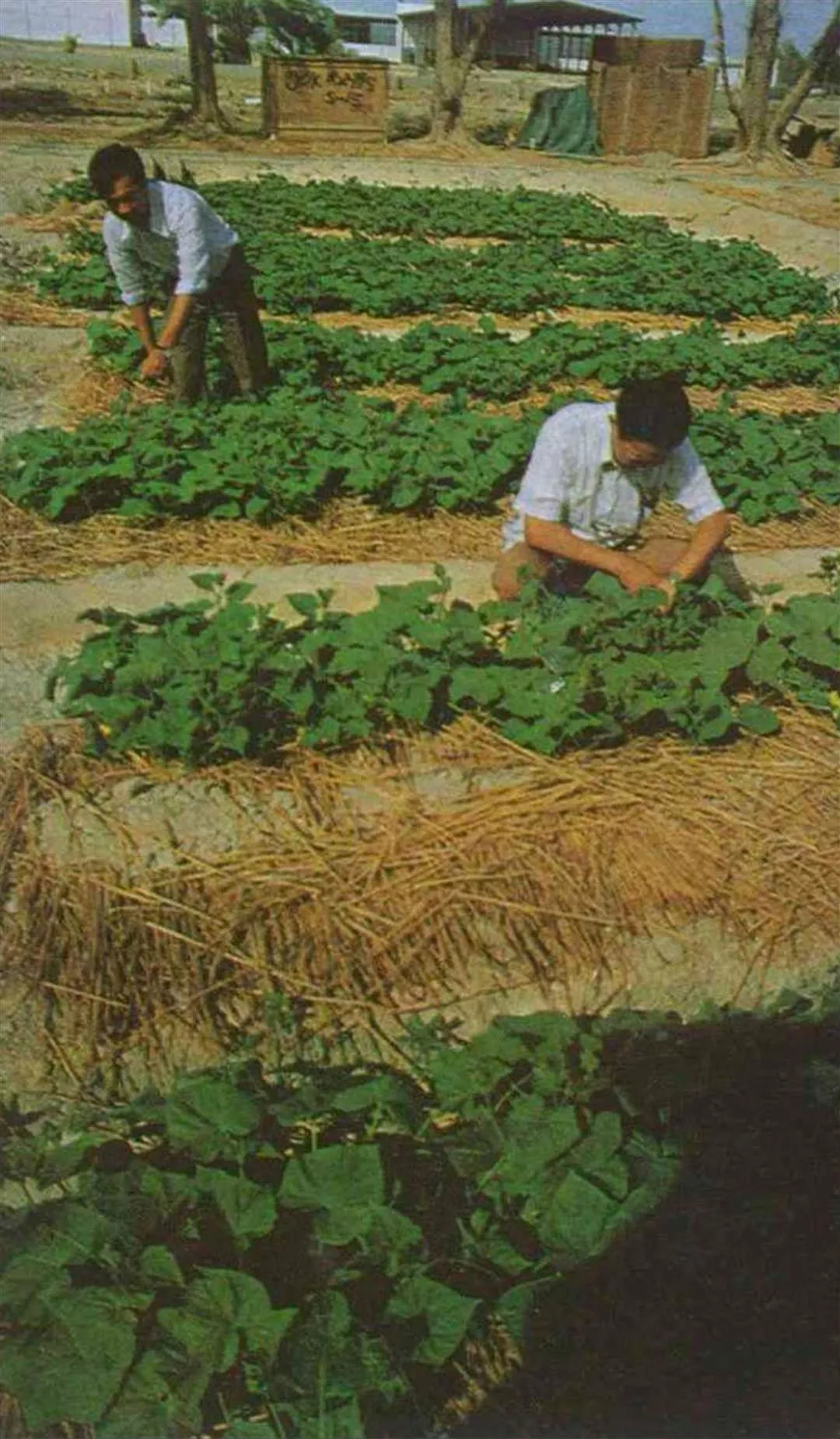 農技人員檢視哈蜜瓜的生長情形,圖中前者為團長林正義。在土壤上覆蓋稻草,是為了使結成的哈蜜瓜不接觸沙土,以保持表皮清潔及避免土中水份侵入。(楊永山)