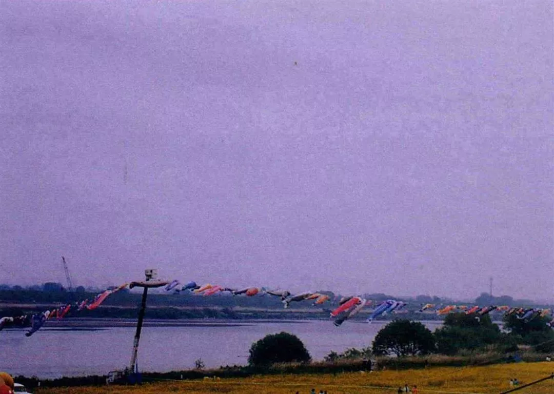 上午十一點半,長一百一十一公尺的巨大鯉魚旗和有著一百公尺長吊臂的大型吊車都已就位。當吊臂緩緩升起時,直徑長六公尺的魚嘴也跟著離開地面,週遭傳來一陣興奮的驚歎聲和加油聲。吊索逐漸縮短,鯉魚的頭部和身體也漸漸離開地面,空氣徐徐灌入鯉魚體內,然後在適時響起的「鯉魚旗歌」歌聲中,鯉魚巨大的尾巴瞬間離開地面,霎時,那七百五怳膜蝑囿漱j鯉魚真有如一心想躍過龍門般地騰空而去,我不禁在心裡替它喝采,也隨著音樂輕哼起來:「鯉魚旗,鯉魚旗,比屋頂還高的鯉魚旗,大的黑鯉是爸爸,小的紅鯉是小孩,大家一起游得好快樂啊,好快樂!」